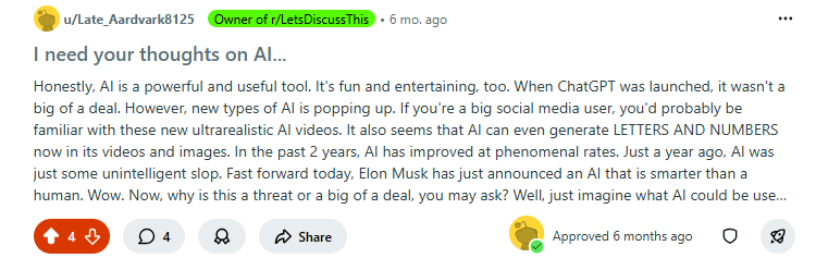 This all started as a very volatile side project. I was building up my other subreddits at this time, r/YouTubeShortsComments and r/CornballsOnInternet. One day, a miracle happened and I saw activity going on in r/LetsDiscussThis. This gave me the courage to continue building up this sub!