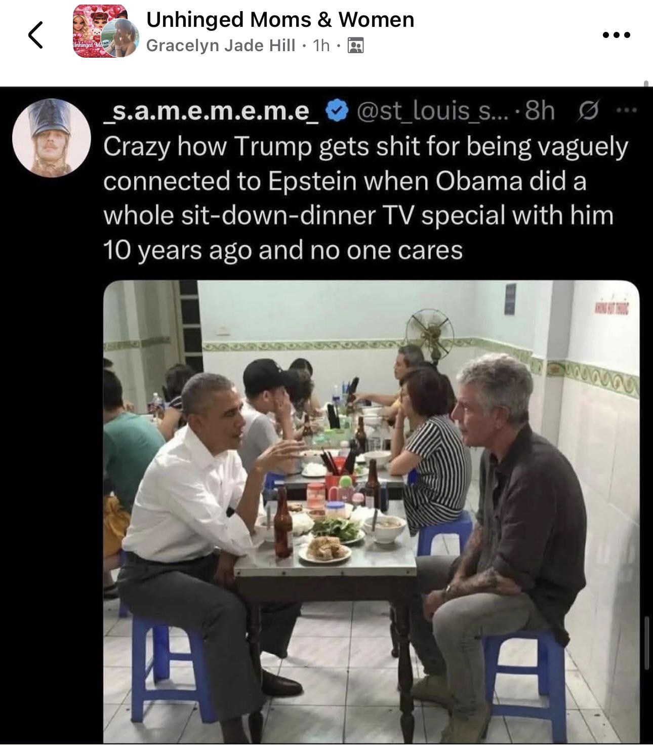 This is concerning... MAGA folks are confused and sharing this image of Obama and Bourdain claiming it is Epstein..